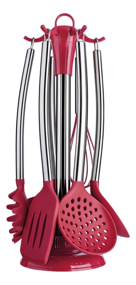 O conjunto de gadgets de silicone com cabo inox 7 peças, possui suporte giratório e pode ir à lava-louças.